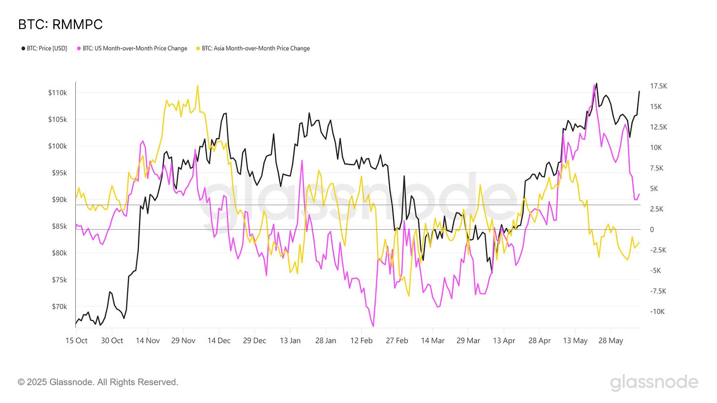 但根據 Glassnode 數據,比特幣在美國市場「按月價格變化」正在下跌,顯示來自美國的機構投資者情緒自 4 月底開始放緩,對比特幣需求下降並有「供過於求」的趨勢,再與最近美國比特幣現貨 ETF 資金流比較,最近兩週確實比特幣 ETF 流出比流入多,局部印證了 Glassnode 數據的看法。